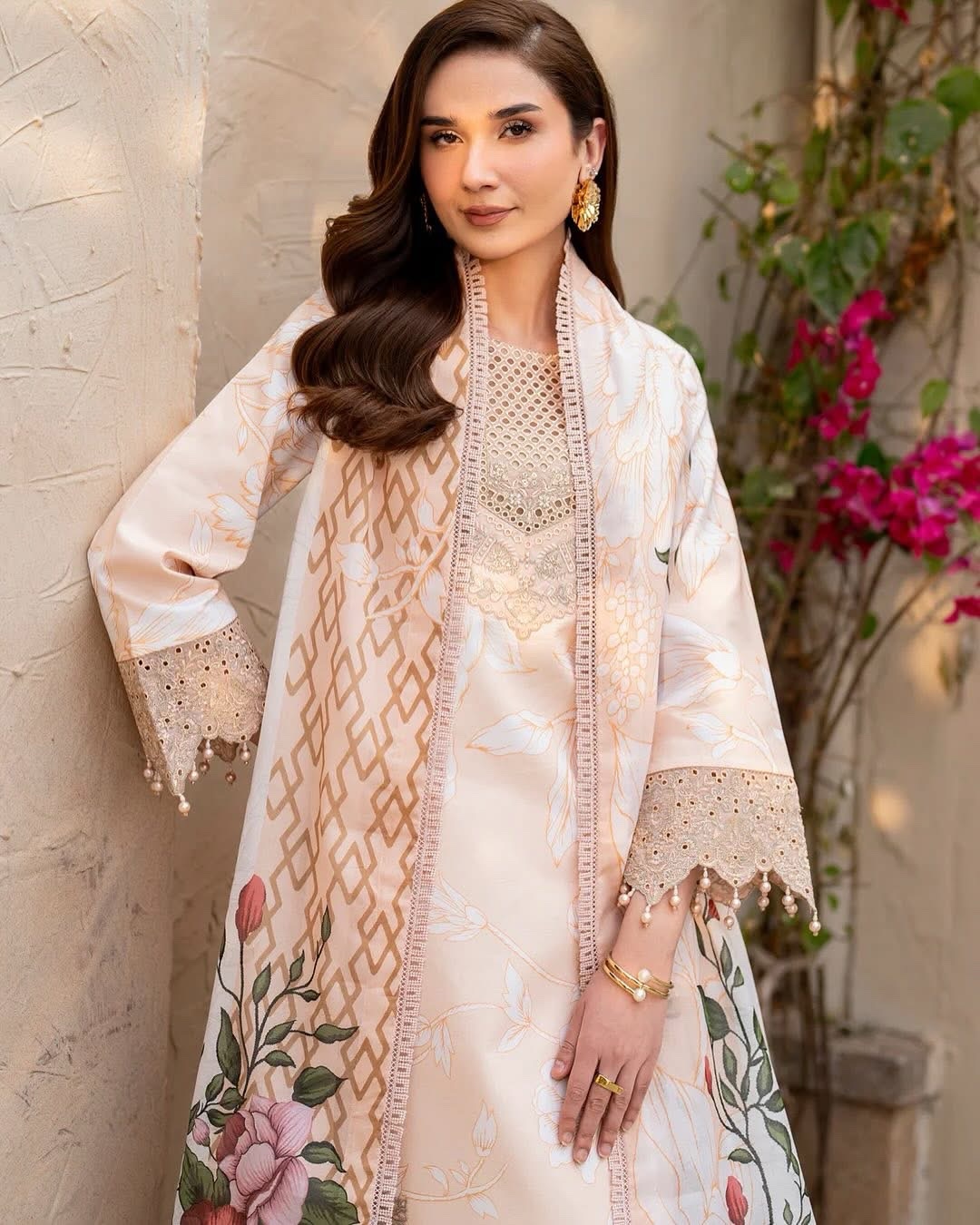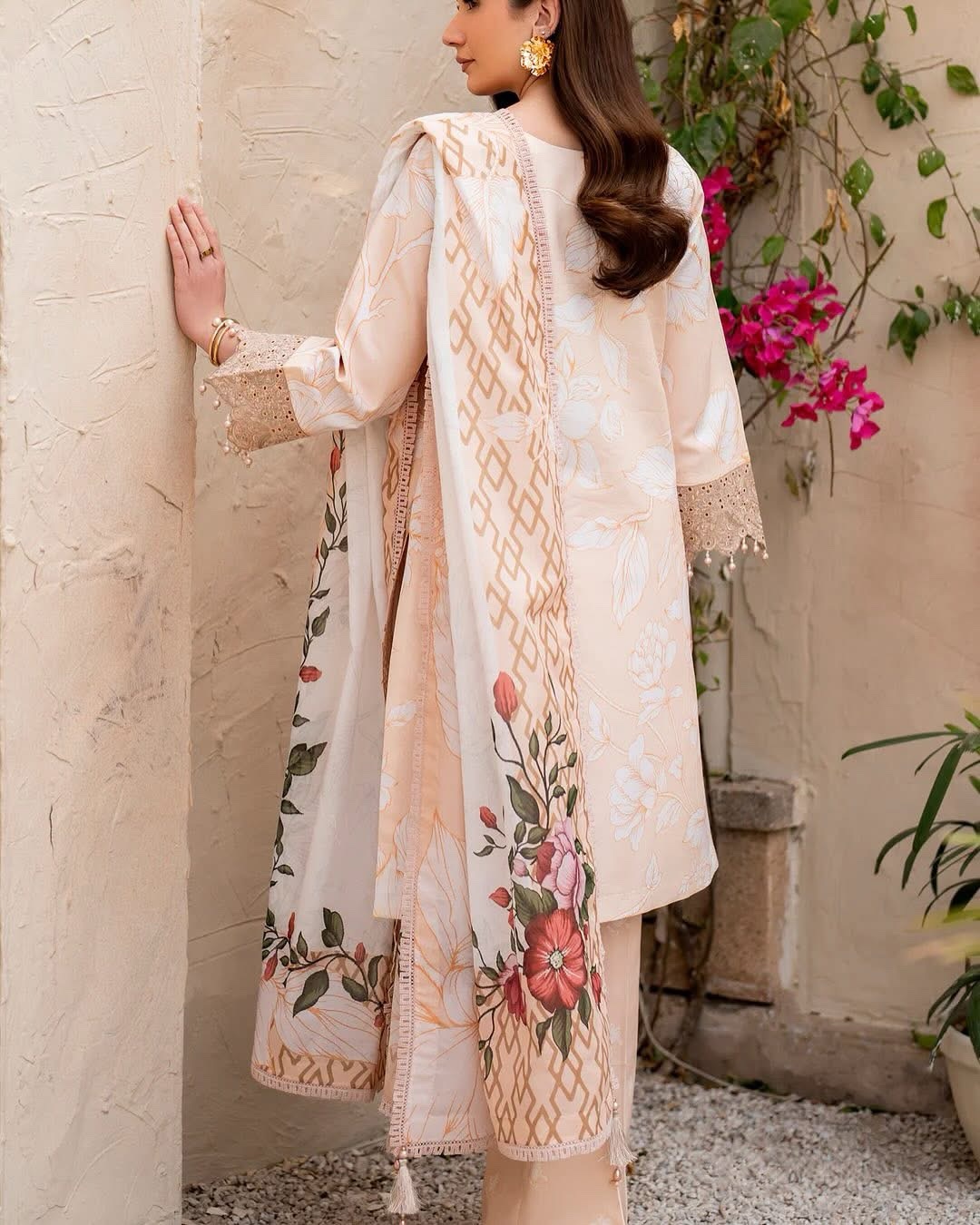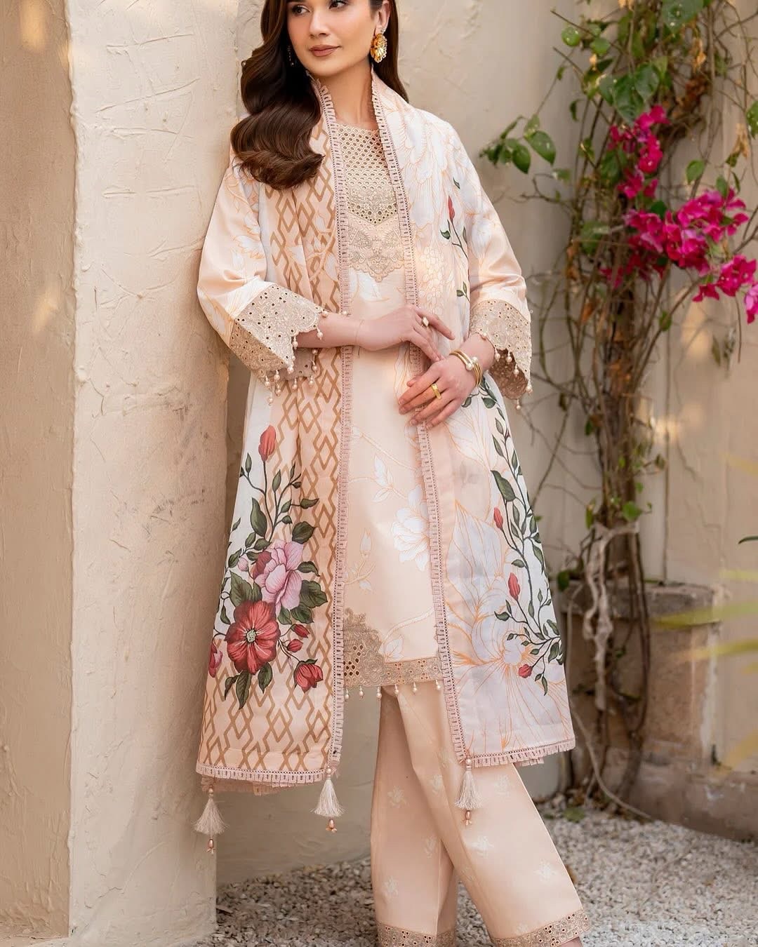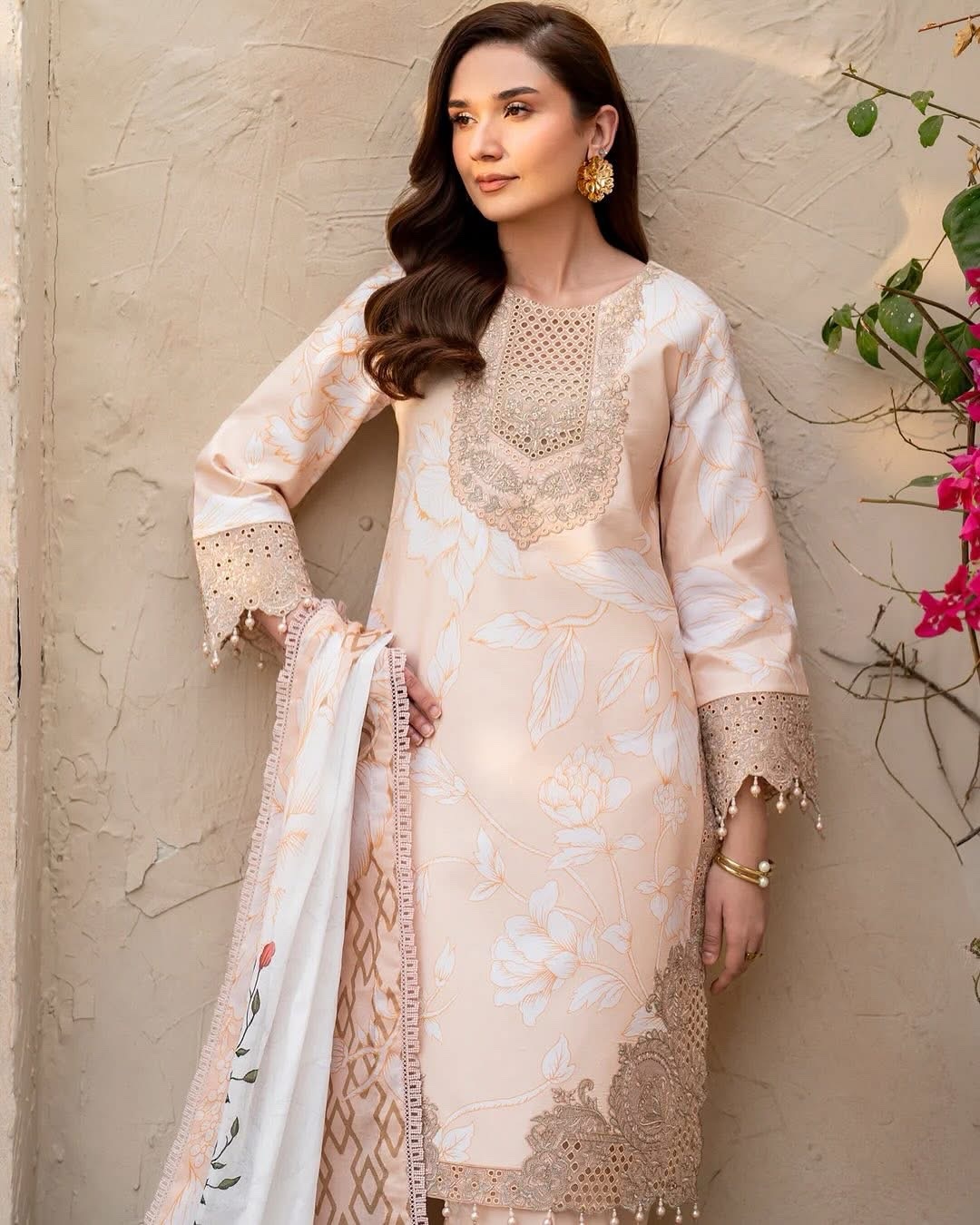 Kaai in soft pink is a poetic tribute to the delicate charm of spring. This digitally printed lawn embroidered outfit features a beautifully detailed front and sleeves, enhanced with matching cutwork. Paired with printed lawn trousers and a digitally printed voile dupatta, it captures the essence of the seasonβs softness in every thread.