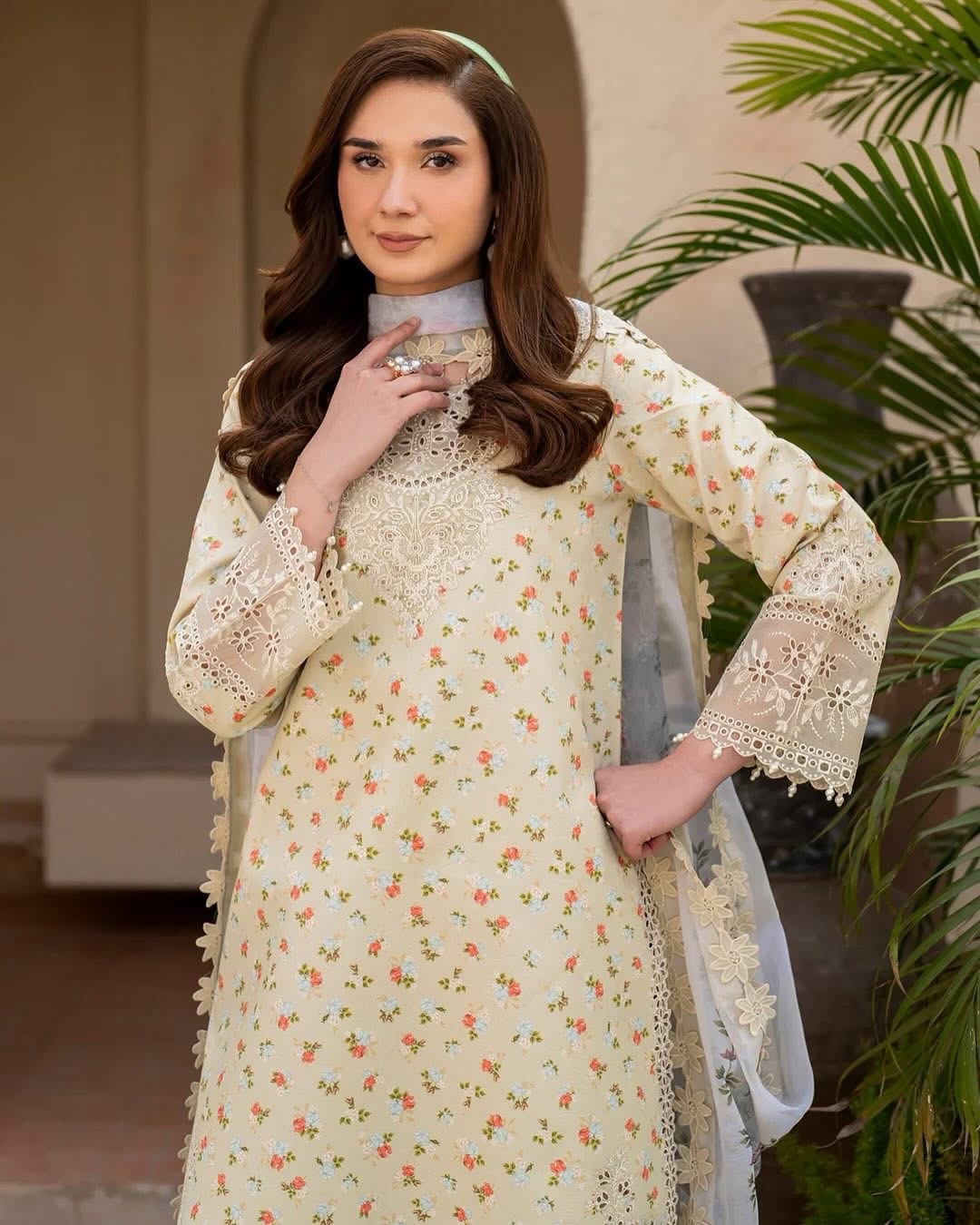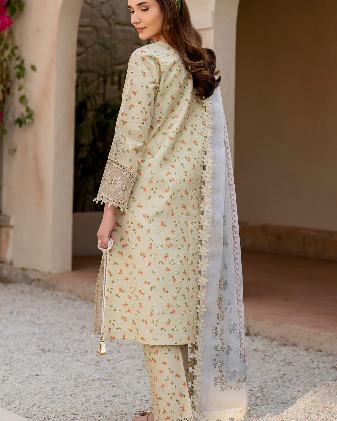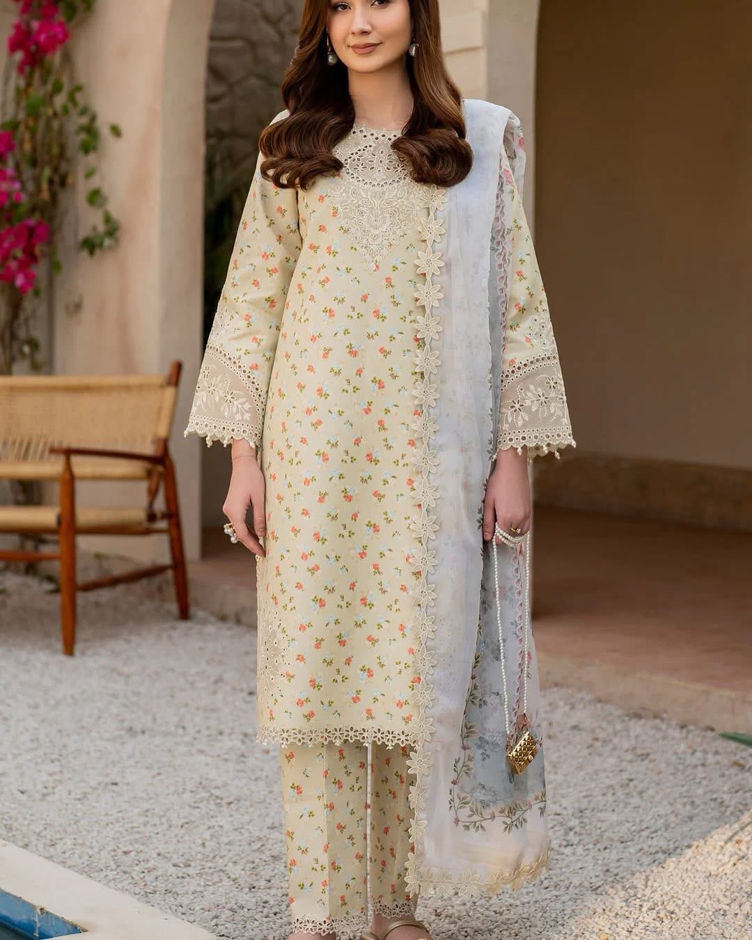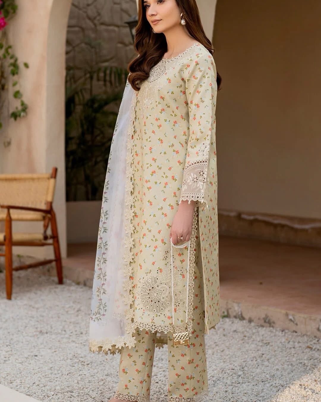 Make a statement with Solara – a vibrant yellow digitally printed lawn shirt featuring intricately embroidered sleeves and a beautifully detailed embroidered patti on the hem and sleeves. Paired with printed trousers, this ensemble is enhanced by a digitally printed chiffon dupatta, adding an elegant touch of sophistication.