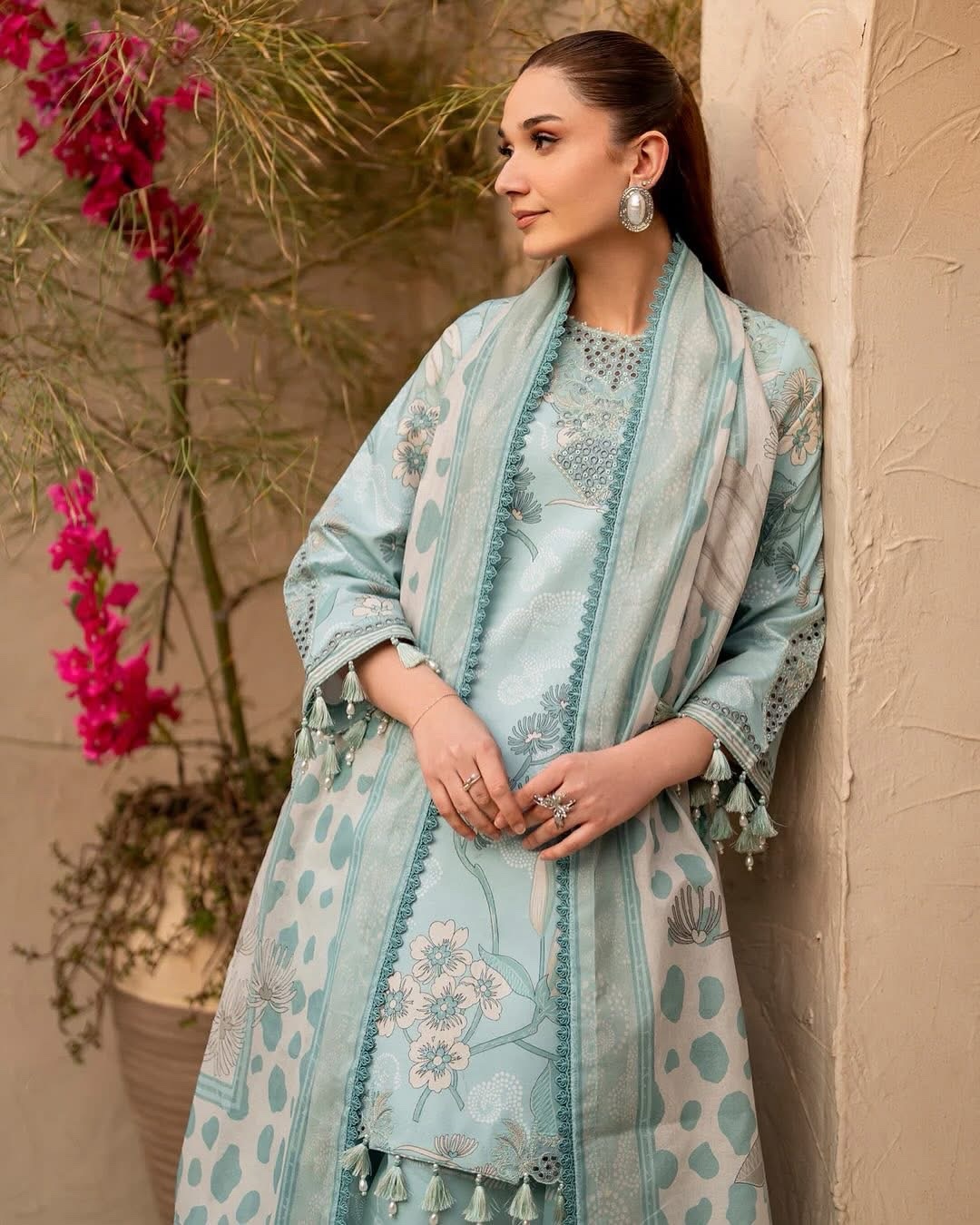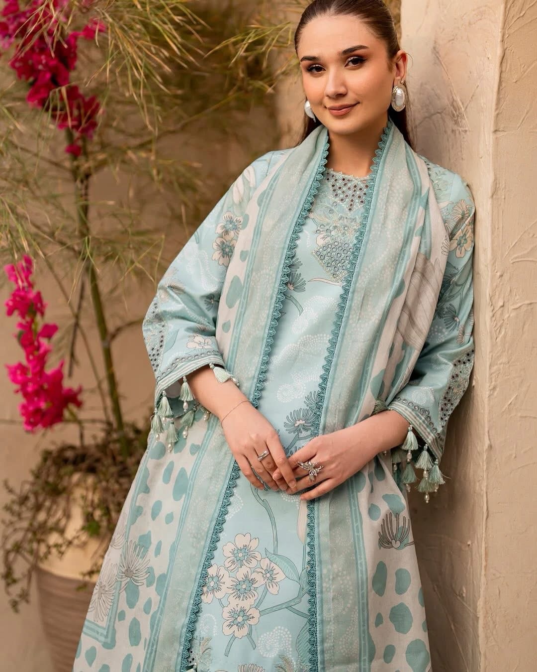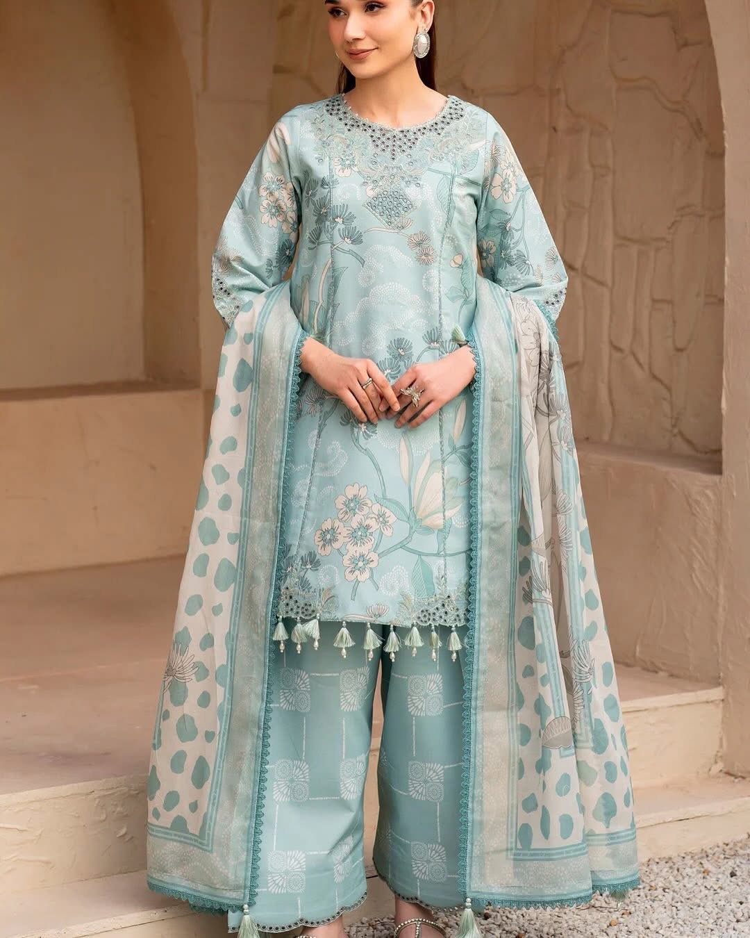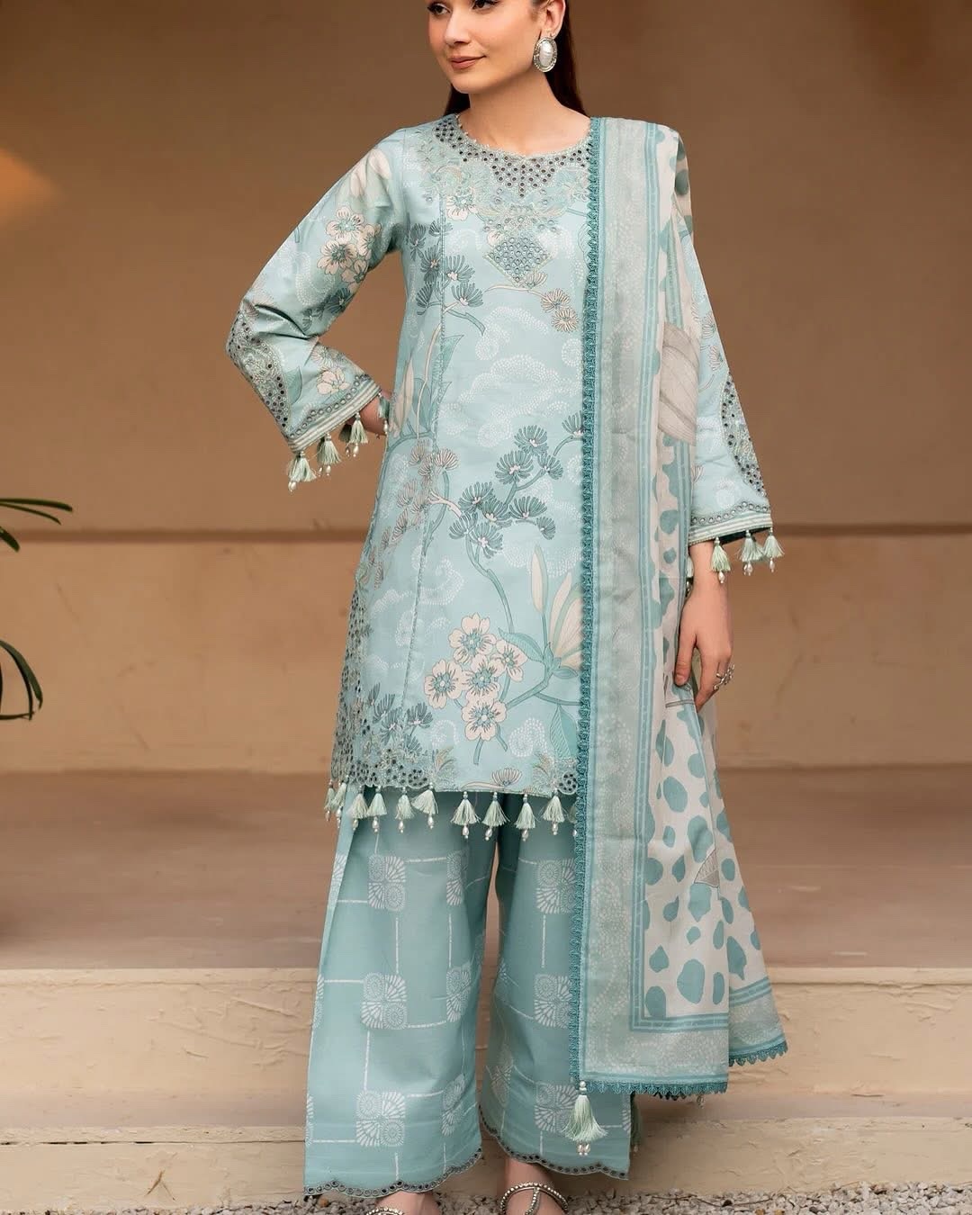 Fawn in light blue is a serene fusion of elegance and grace. This digitally printed embroidered shirt, paired with printed trousers and a voile dupatta, captures the refreshing spirit of spring. A vision of sartorial harmony, this dress is the perfect choice for Eid wear.