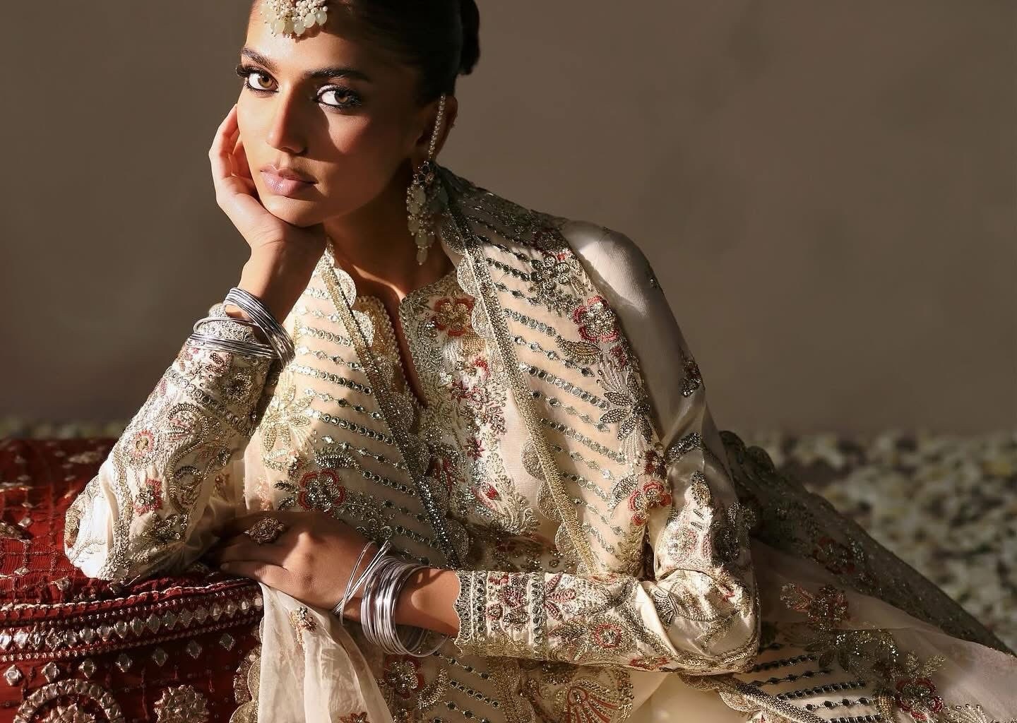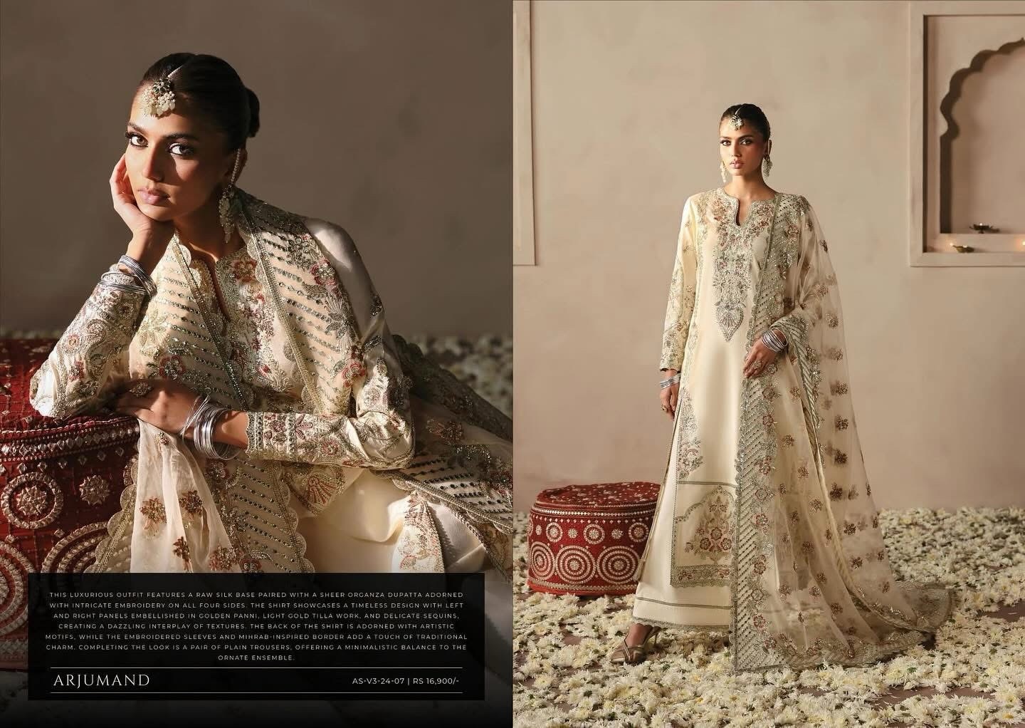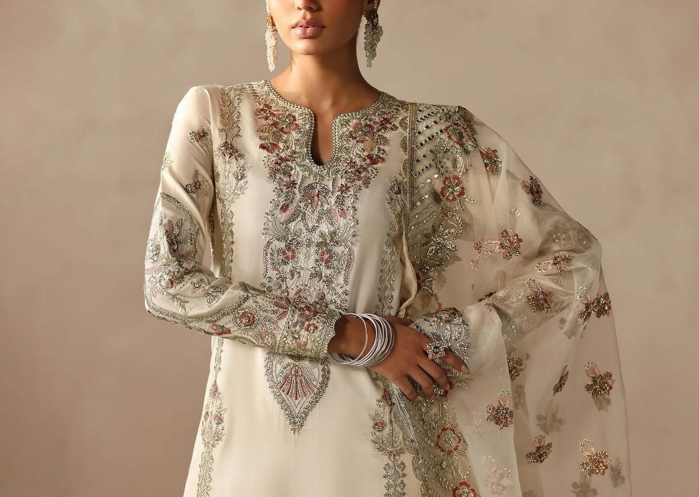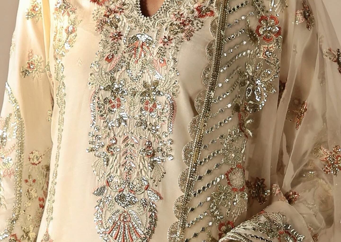 This luxurious outfit features a raw silk base paired with a sheer organza dupatta adorned with intricate embroidery on all four sides. The shirt showcases a timeless design with left and right panels embellished in golden panni, light gold tilla work, and delicate sequins, creating a dazzling interplay of textures. The back of the shirt is adorned with artistic motifs, while the embroidered sleeves and mihrab-inspired border add a touch of traditional charm. Completing the look is a pair of plain trousers, offering a minimalistic balance to the ornate