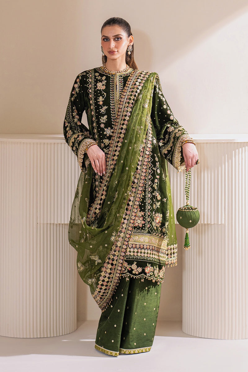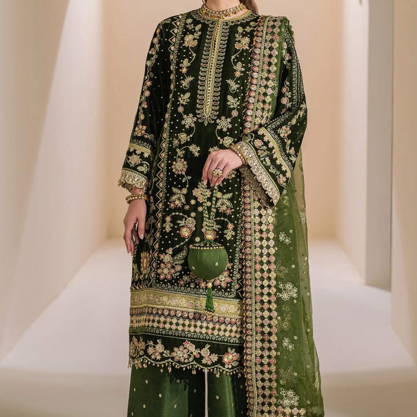 Shirt: This dark green velvet shirt is beautifully decorated with gold thread embroidery. The designs feature intricate floral and geometric patterns that cover the front panel and extend to the sleeves. The back of the shirt is simpler, with a plain velvet base and an embroidered border.