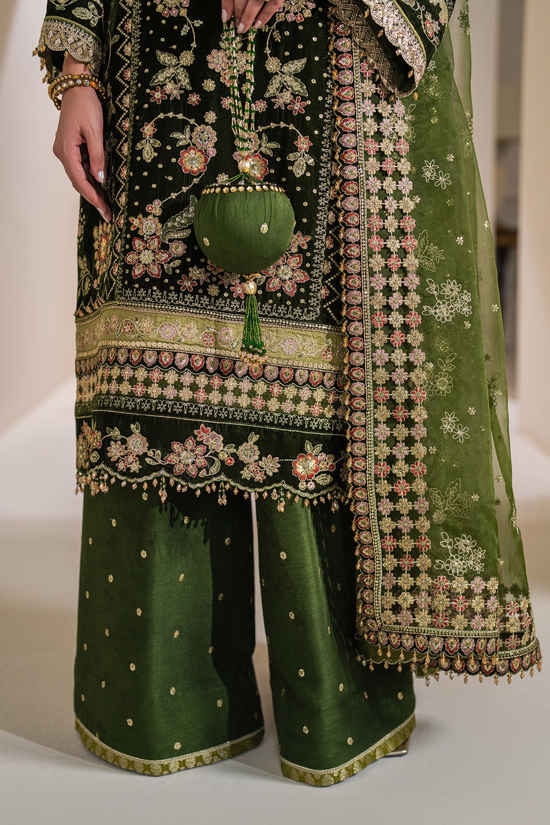 Trouser: The trousers are made from soft silk fabric adorned with sequins and jamawar border, providing a slight sheen.