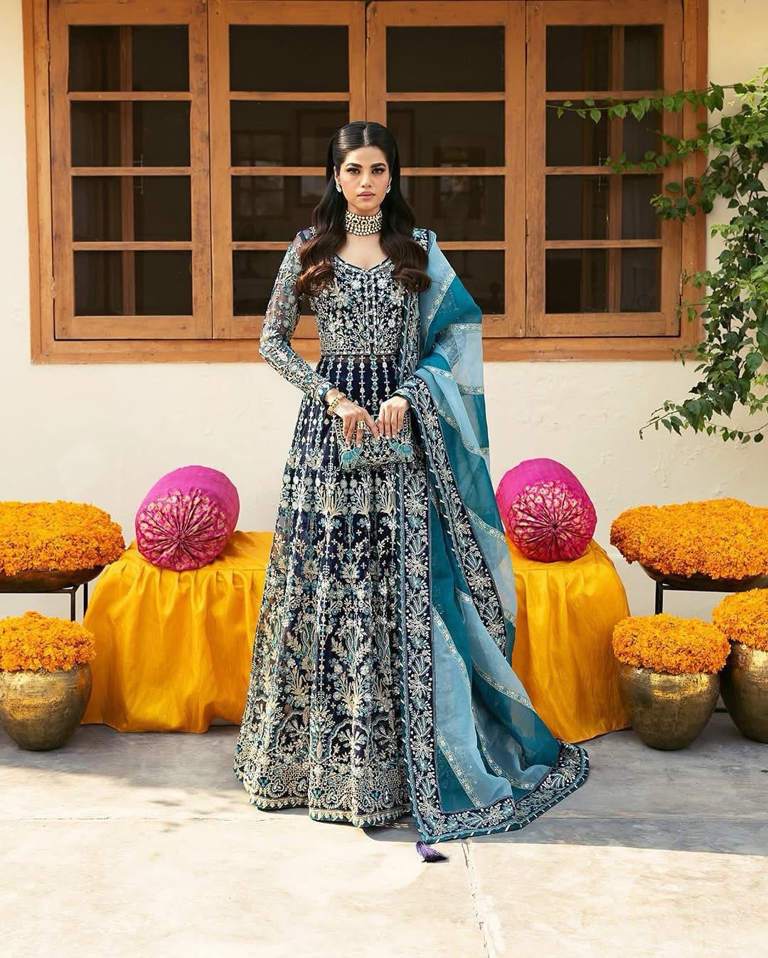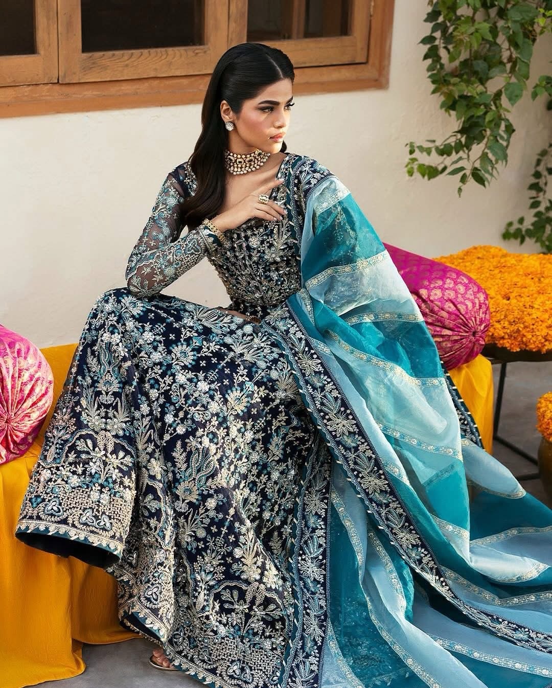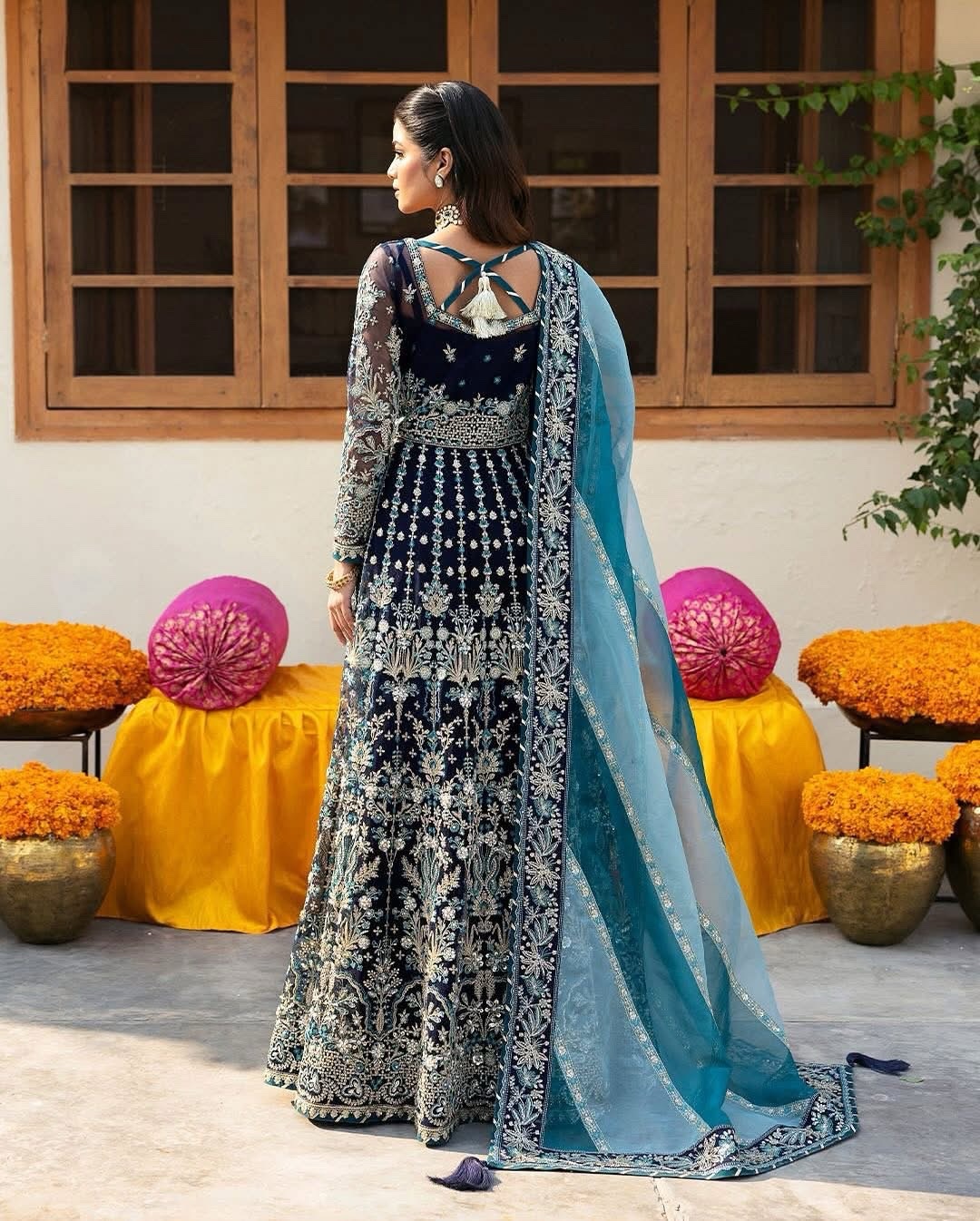 Maahru – a vision of timeless elegance, featuring adda-worked, sheesha-embellished, and intricately embroidered organza. The front bodice sets a graceful tone, paired with sequined sleeves and a 12-panel angrakha adorned with delicate organza borders. The embroidered organza dupatta, enhanced with peach and maroon raw silk motifs on the pallu adds a touch of regal charm. Golden zari tassels and a dyed raw silk lehnga complete this masterpiece, making Maahru the perfect blend of tradition and sophistication