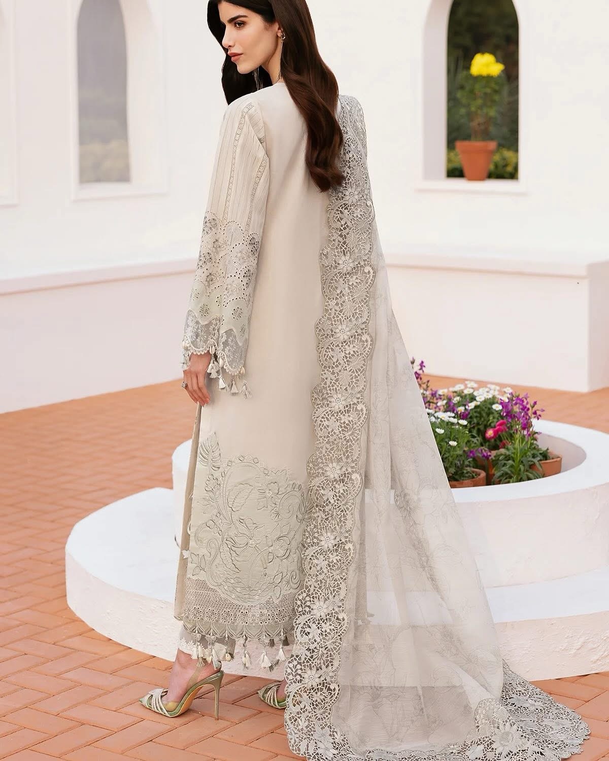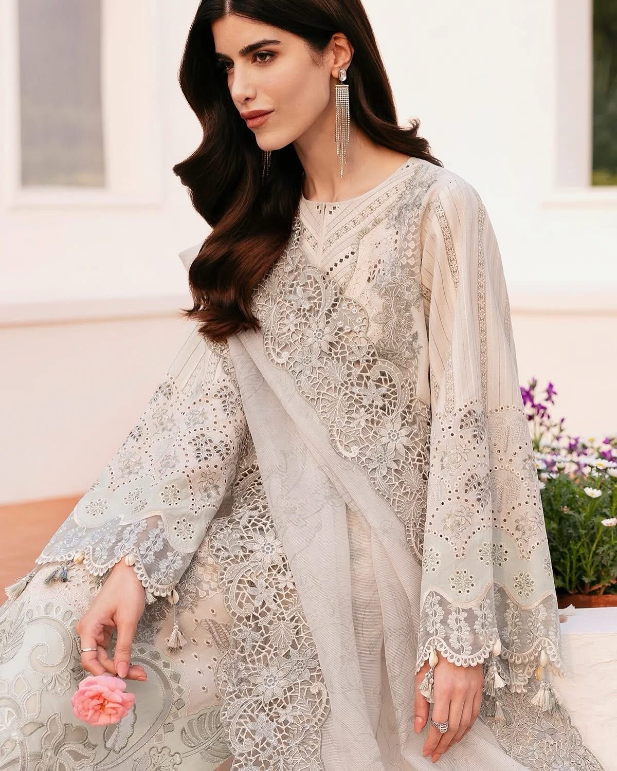 This schiffli outfit exudes a soft, dreamy vibe with its creamy tones and subtle mint highlights. Embroidered self-jacquard panels and borders meld to create a visually captivating display, enhanced further by the delicately printed silk dupatta. The entire look is a testament to understated elegance, perfect for Eid gatherings.