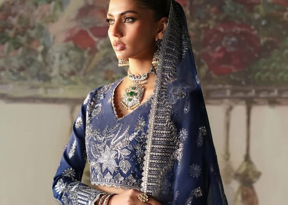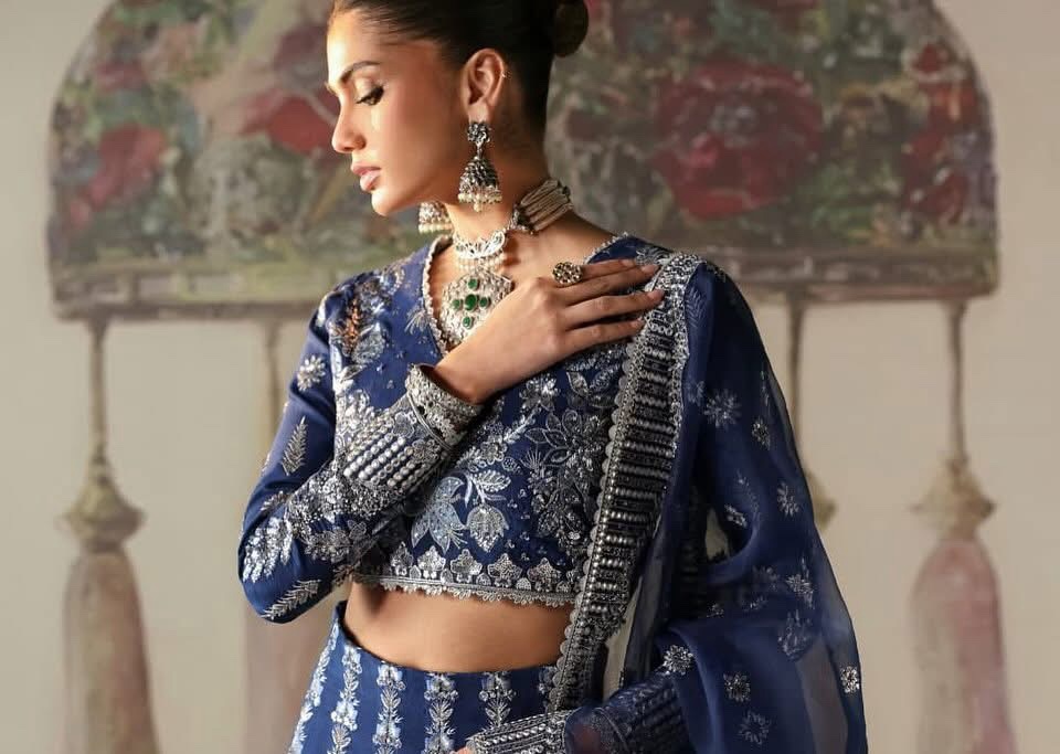 This graceful lehnga choli is tailored from rich blue raw silk, exuding refinement and charm. The front and back body, along with the sleeves, are adorned with intricate embroidery, showcasing silver panni, tilla, and sequins for a refined, luminous effect. Paired with raw silk lehnga, showcase floral embroidered panels adding a regal and ethereal charm. The organza dupatta is elevated by a four-sided embroidered border and detailed embroidered pallu.