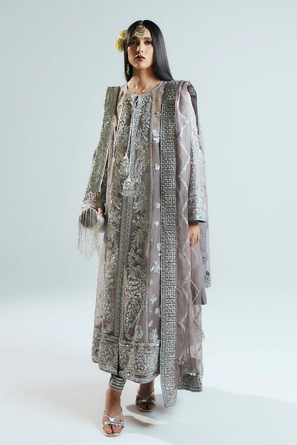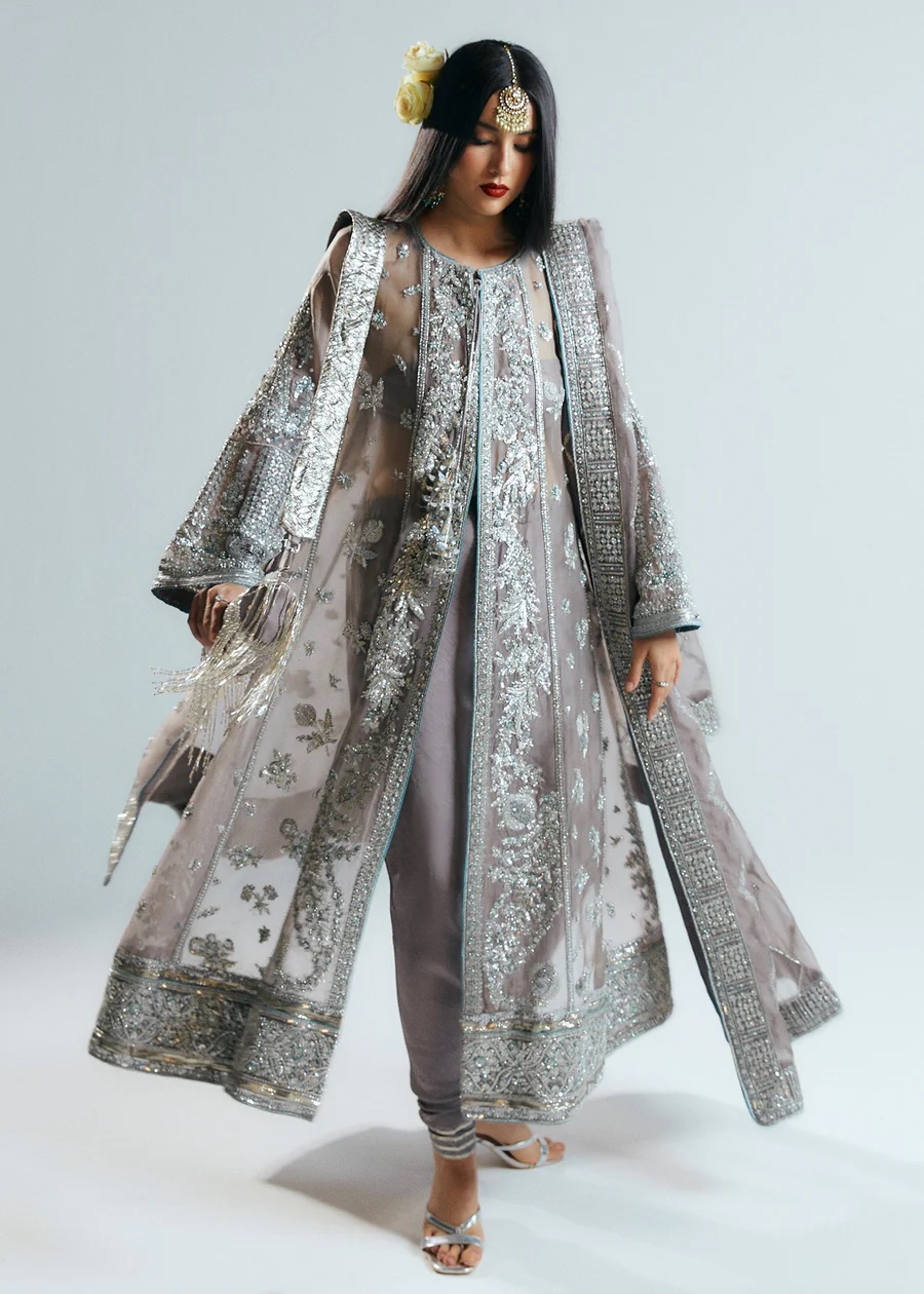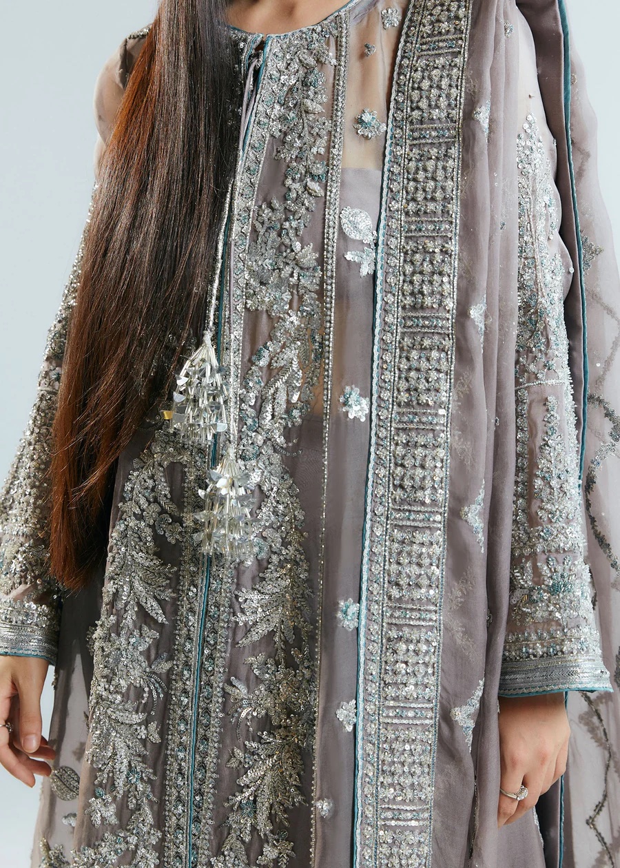 A perfect illustration of dazzling hues features stunning Grey organza Jacket composed with three different panels on each side. Each panel is embellished with intricate handwork details of sequins,bugle beads along with korean rawsilk choridar. Paired with a detailed embroidered organza dupatta enhanced with intricate handwork details on four side border, setting a timeless appeal.