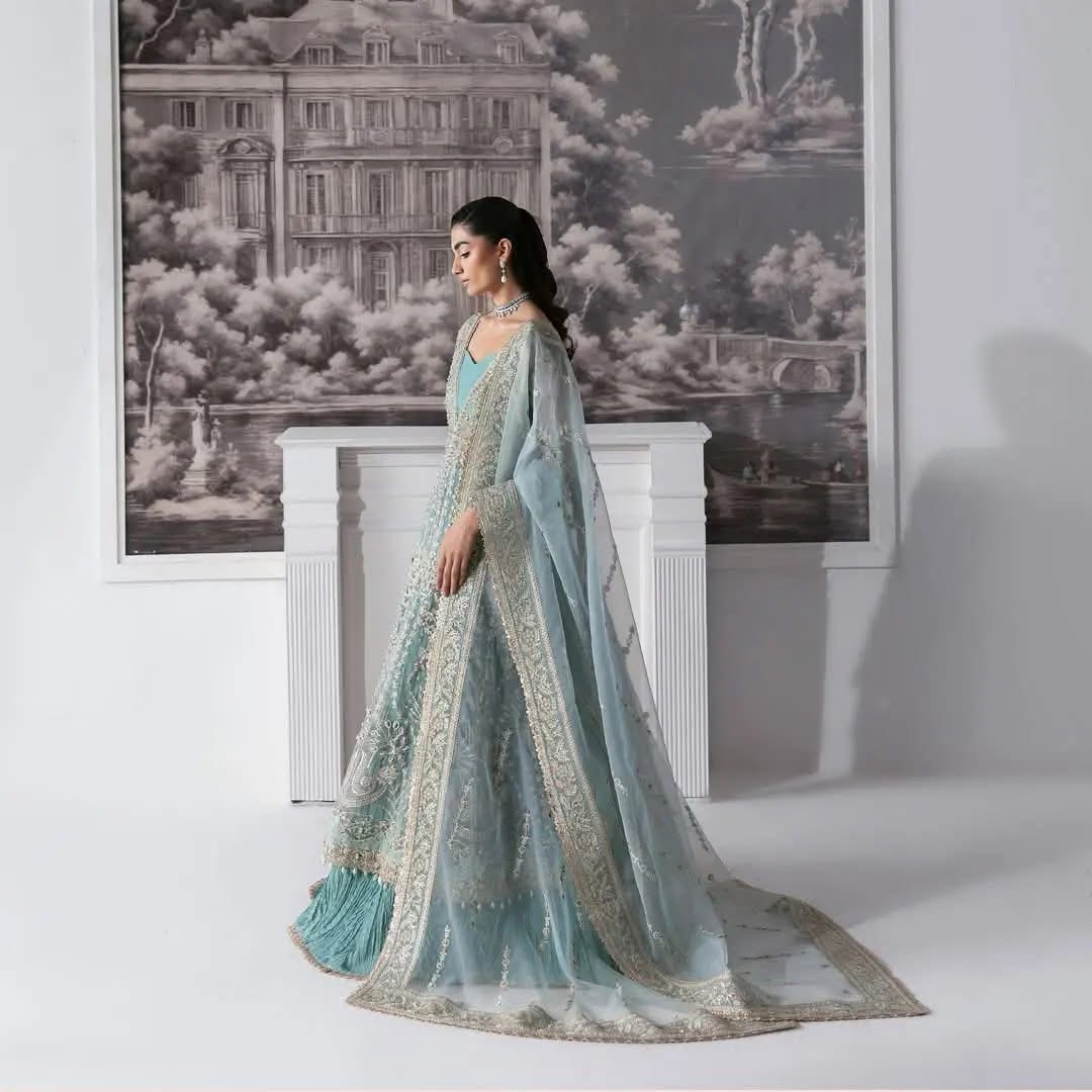 Embrace timeless sophistication with this elegant set, featuring hand-embellished embroidered net panels for the front, back, and sleeves. It includes an embroidered organza lehenga border, dupatta, and sleeves border, along with dyed raw silk trousers. This beautifully crafted ensemble is perfect for any special occasion, radiating charm and grac