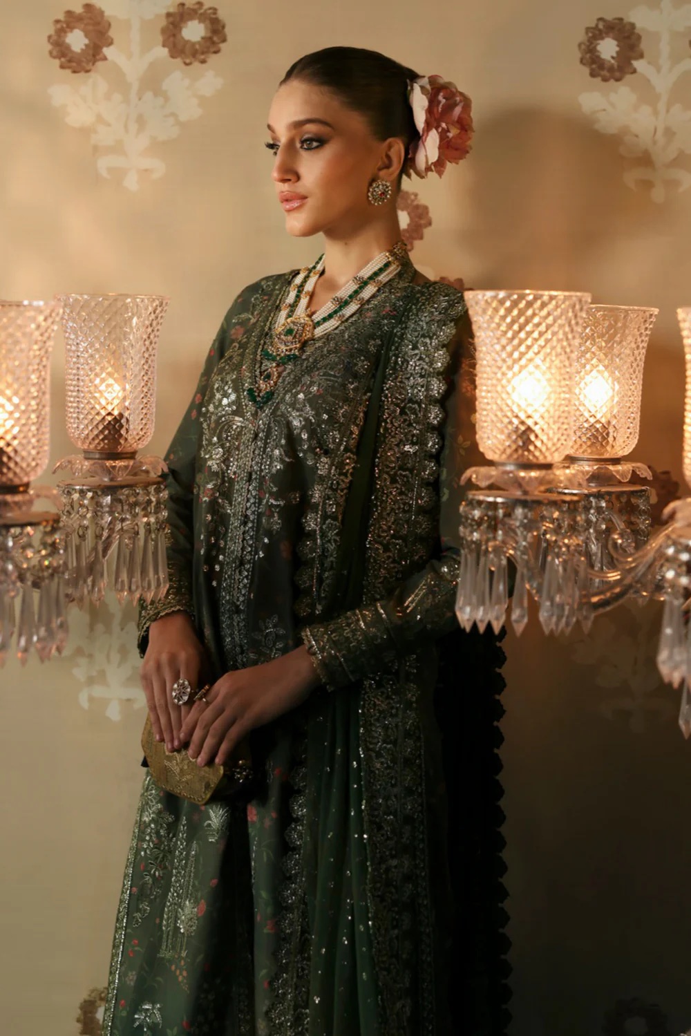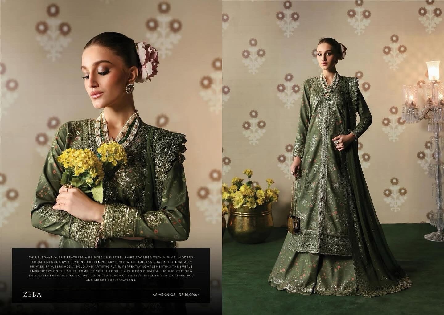 This elegant outfit features a printed silk panel shirt adorned with minimal modern floral embroidery, blending contemporary style with timeless charm. The digitally printed trousers add a bold and artistic flair, perfectly complementing the subtle embroidery on the shirt. Completing the look is a chiffon dupatta, highlighted by a delicately embroidered border, adding a touch of finesse. Ideal for chic gatherings and modern celebrations.